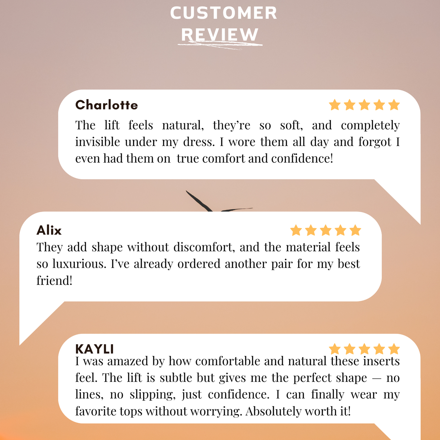 Our inserts offer a gentle, seamless lift that blends perfectly with your body. No bulk. No stiff padding. Just a soft, breathable design that gives you a flattering silhouette under any outfit.